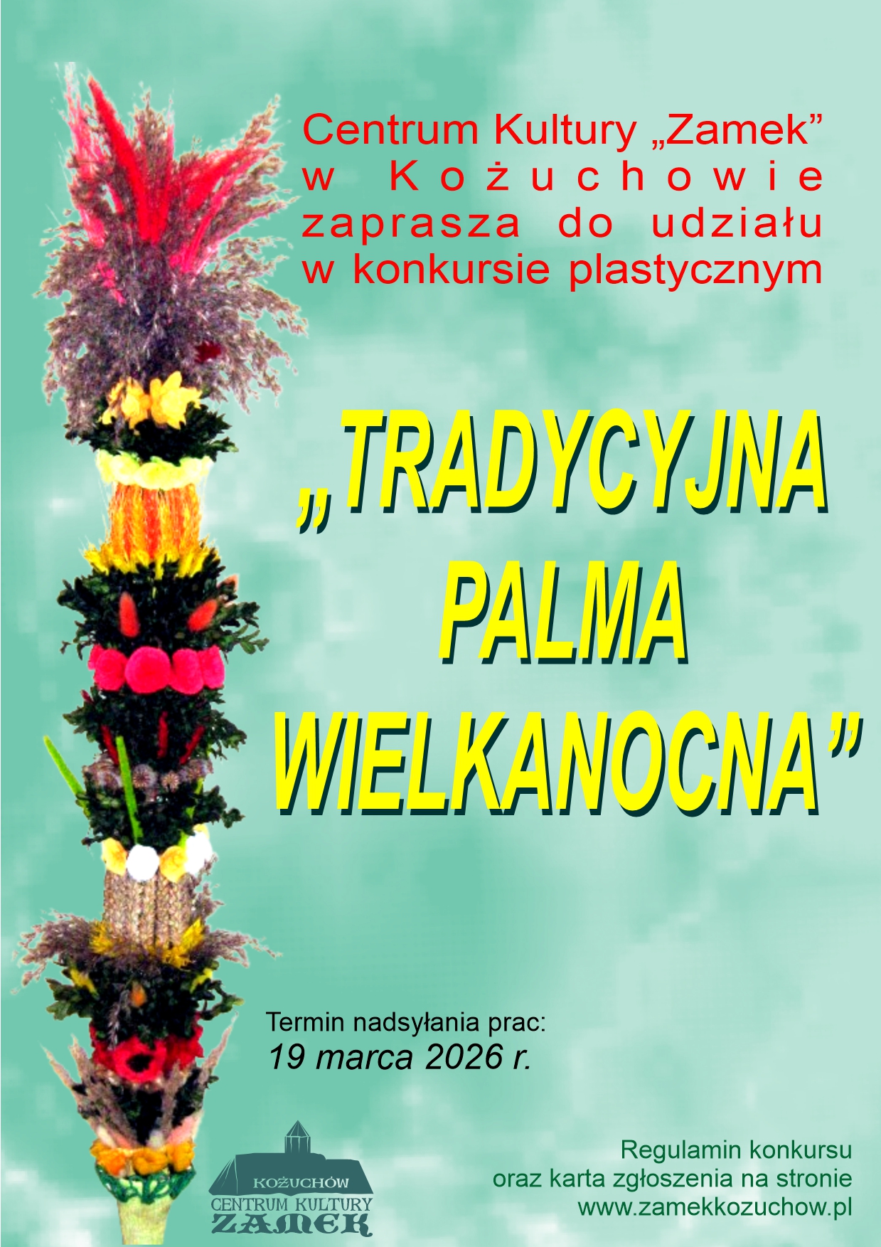 Bez kategorii Konkurs „Tradycyjna palma wielkanocna” 2026 by zamek lut 24, 2026 0 Comment Regulamin konkursu „Tradycyjna palma wielkanocna” 2026Pobierz karta zgłoszenia osoby niepełnoletniePobierz karta zgłoszenia osoby pełnoletniePobierz Centrum Kultury "Zamek" w KożuchowiekonkursKonkurs plastycznykożuchówmarzecPalmatradycjawielkanoczamek